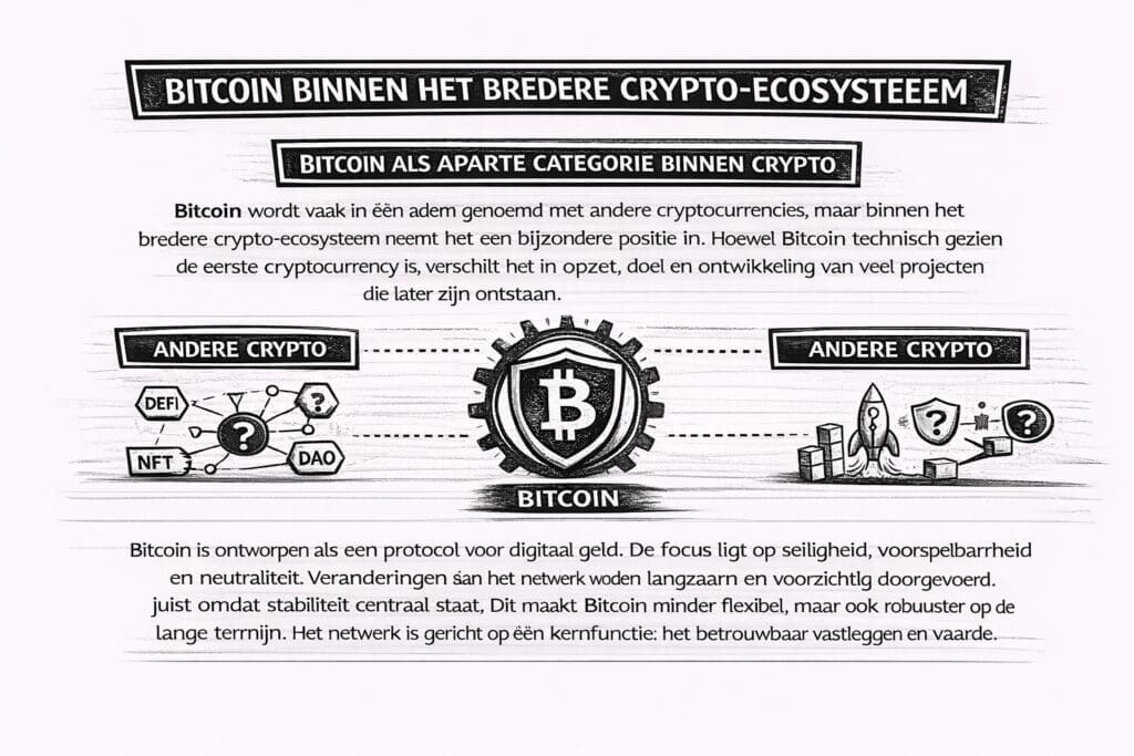 Deze ontwerpkeuze betekent dat Bitcoin niet probeert een breed technologisch platform te zijn, maar zich bewust beperkt tot één rol. Juist die beperking verklaart waarom Bitcoin conceptueel afwijkt van veel andere crypto-projecten.