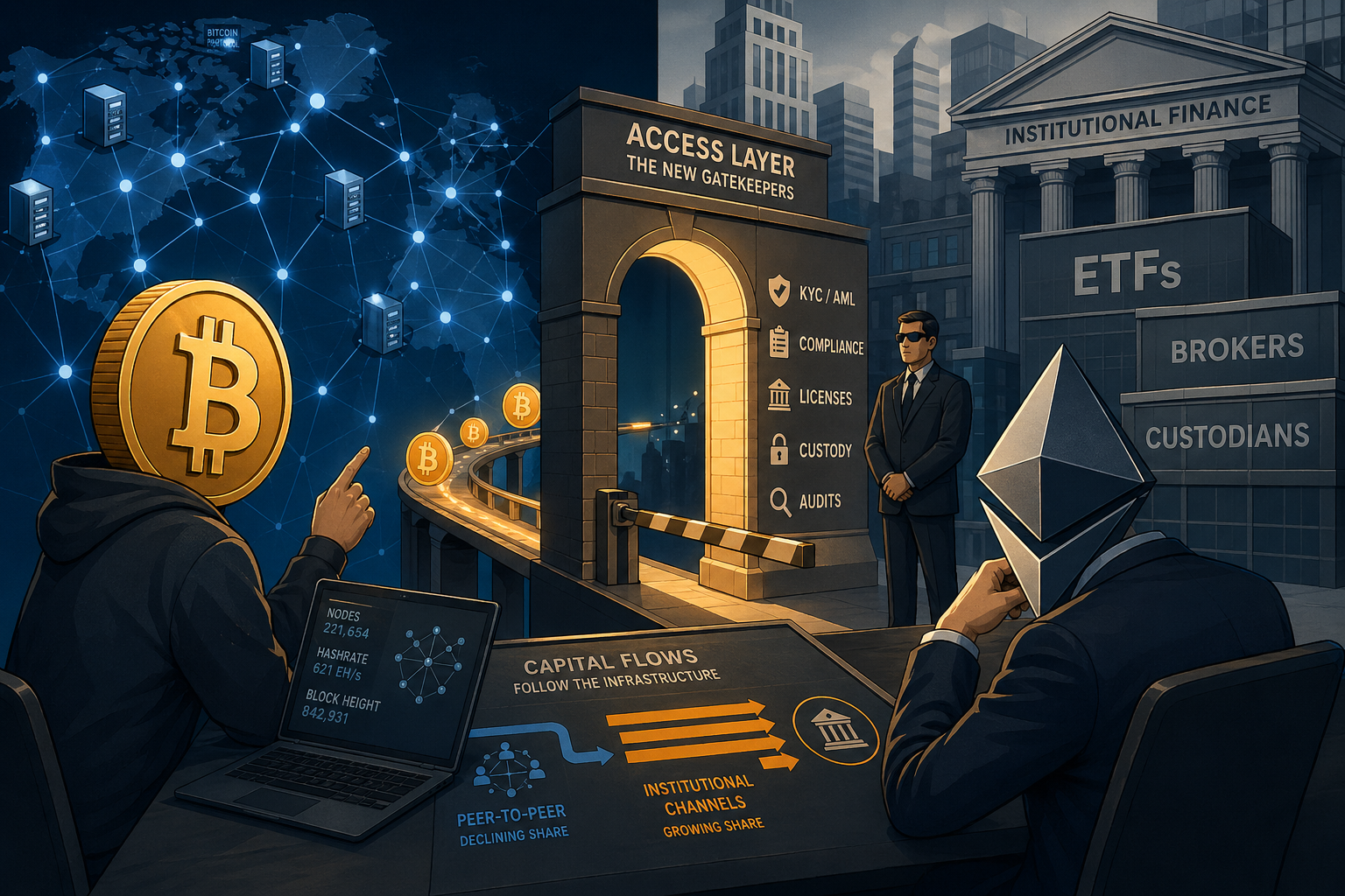 De meest ingrijpende verschuiving gebeurt zonder dat er iets aan Bitcoin zelf verandert. Het netwerk blijft open, maar het gebruik ervan wordt steeds vaker gefilterd door lagen die toestemming vereisen.