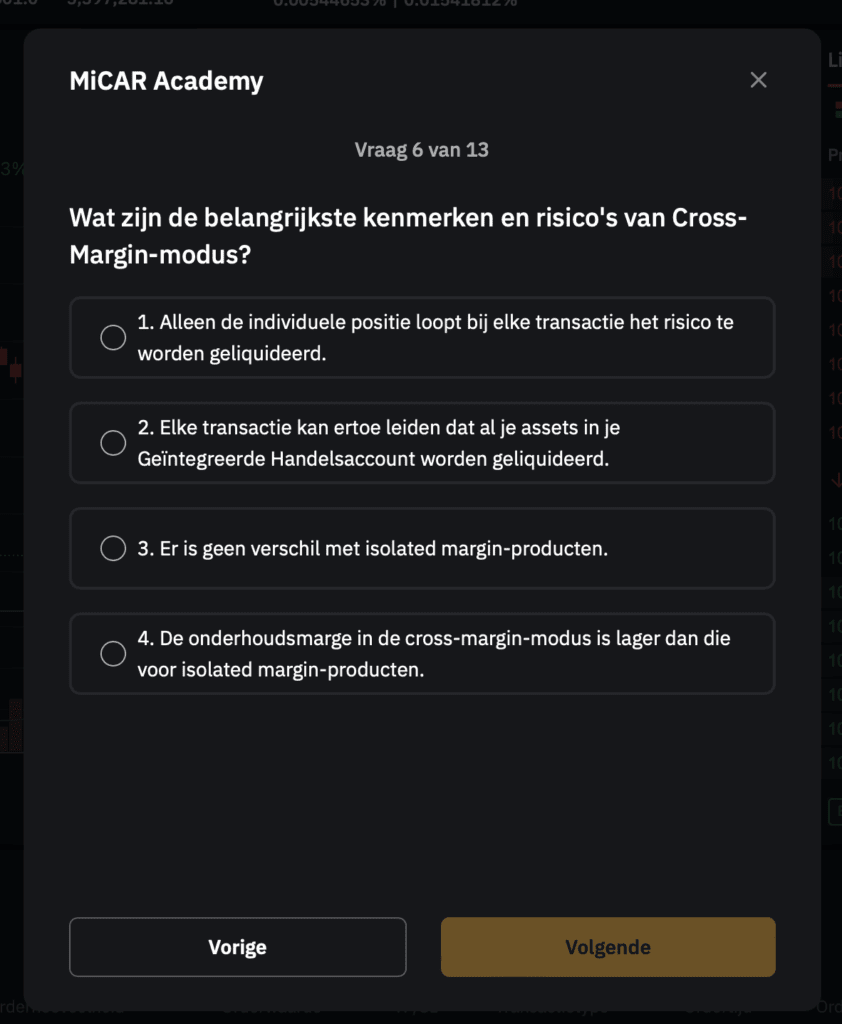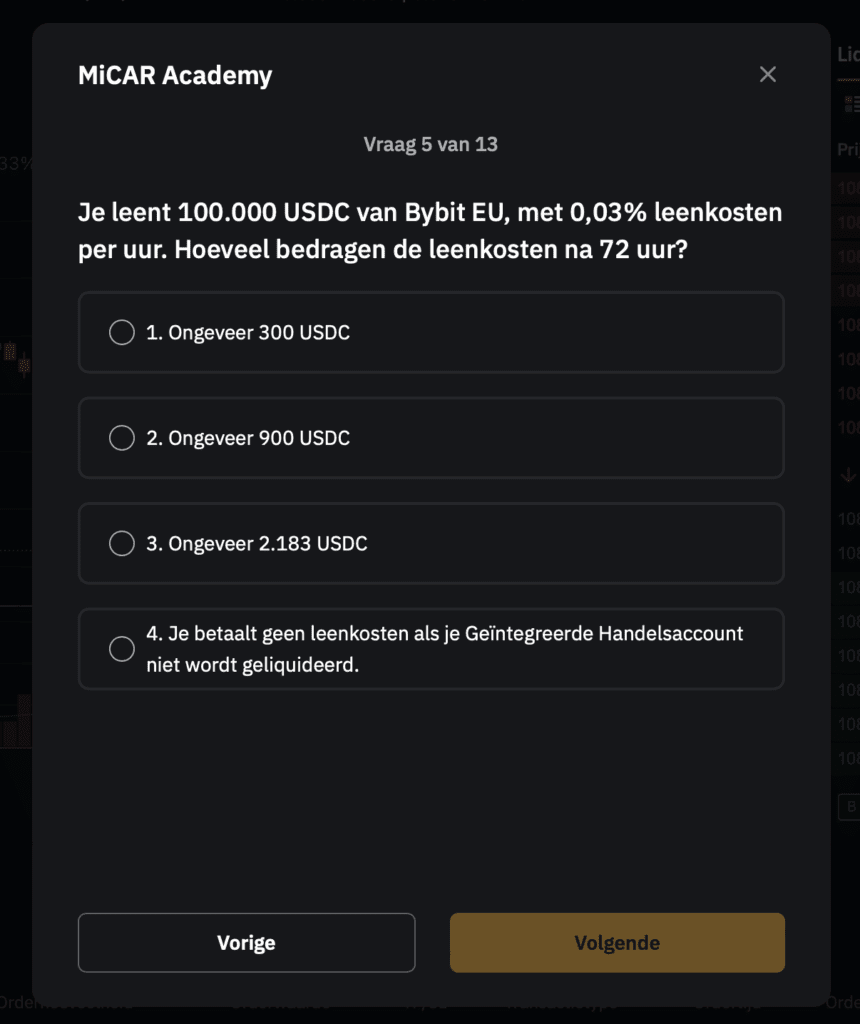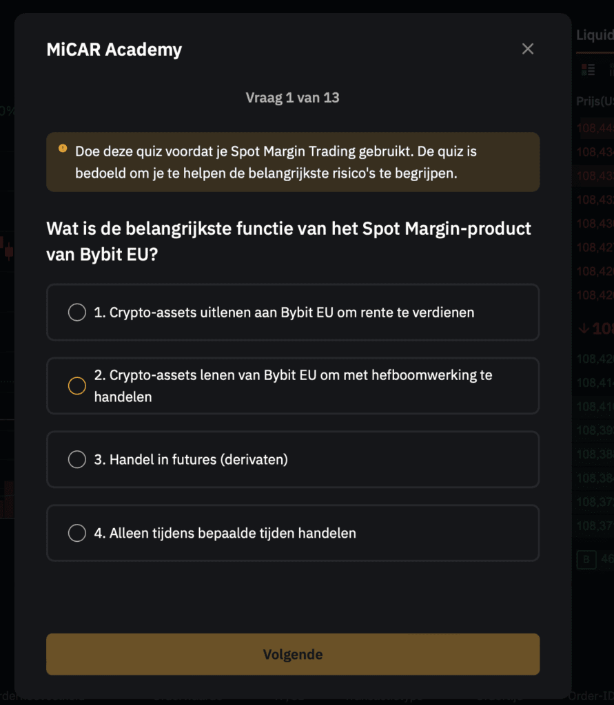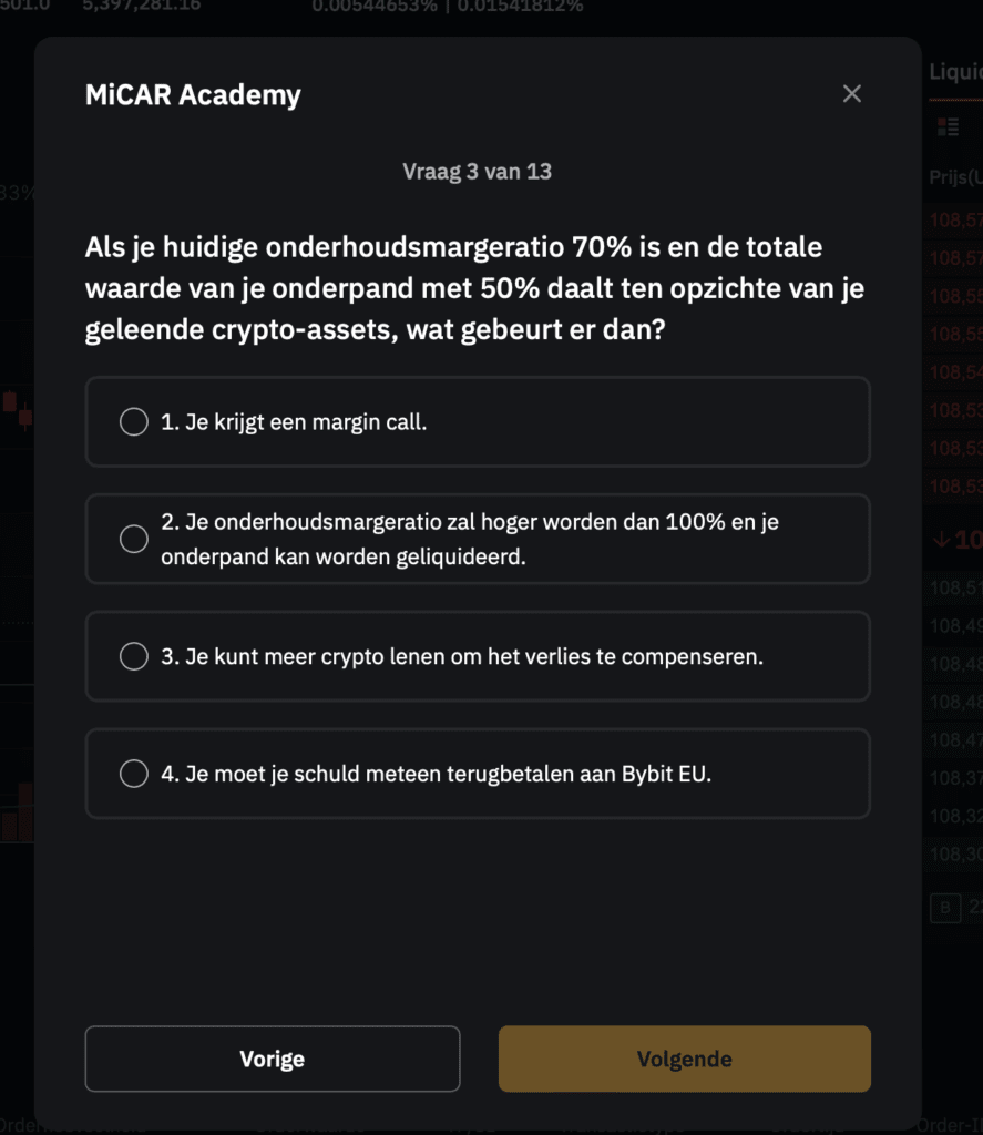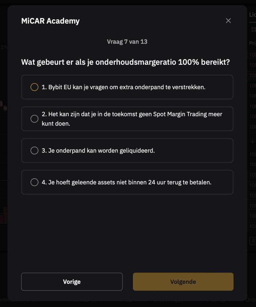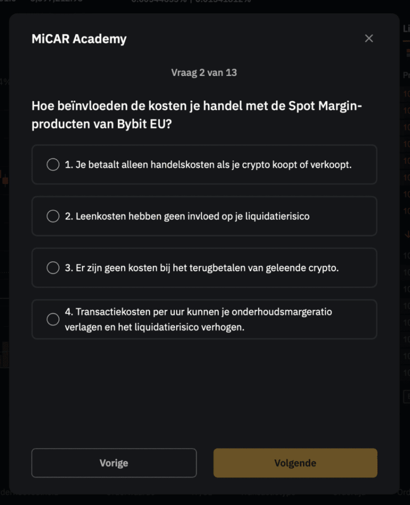 Wie Spot Margin Trading wil activeren bij Bybit EU, moet eerst de MiCAR Academy-quiz doorlopen. Deze quiz bestaat uit dertien vragen en is bedoeld om je bewust te maken van de risico’s die bij margin trading komen kibjken. Het gaat dus niet alleen om het invullen van de juiste antwoorden, maar vooral om het begrijpen van de achterliggende logica. In dit artikel geven we een volledig overzicht van alle vragen, de juiste antwoorden en een uitgebreide uitleg waarom dit zo is.