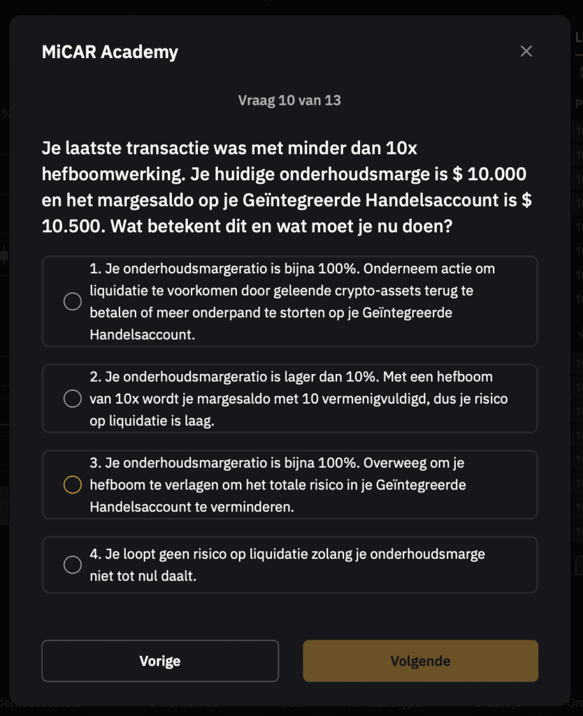 ✅ Het juiste antwoord is: vOptie 1: Je onderhoudsmargeratio is bijna 100%. Onderneem actie om liquidatie te voorkomen door geleende crypto-assets terug te betalen of meer onderpand te storten op je Geïntegreerde Handelsaccount.