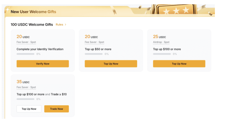 Zodra je een account aanmaakt, kun je beginnen met het verifiëren van je identiteit. Na deze stap ontvang je direct een eerste beloning. Vervolgens word je aangemoedigd om een eerste storting te doen. Bij een storting van minimaal 50 dollar volgt een extra beloning, en bij 100 dollar wordt deze verder verhoogd. De laatste stap combineert een storting met een kleine trade, waarmee je het volledige bonusbedrag kunt bereiken. Deze opbouw zorgt ervoor dat je rustig kunt wennen aan het platform, terwijl je ondertussen beloond wordt voor je voortgang.