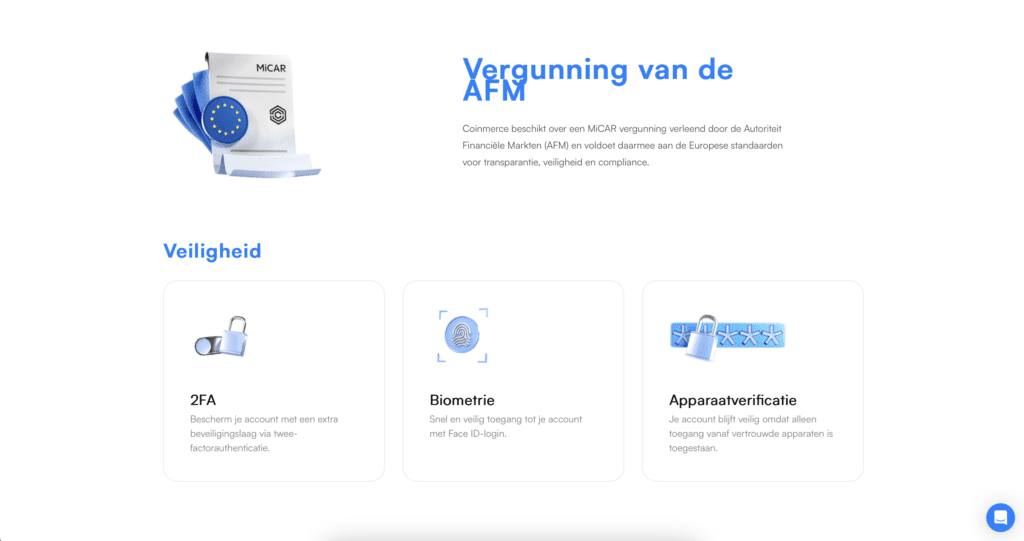 Coinmerce communiceert dat het in 2026 onder het MiCA-kader opereert en hiervoor een vergunningstraject via de AFM heeft doorlopen. Dit betekent dat het platform moet voldoen aan Europese eisen voor transparantie, consumentenbescherming en operationele continuïteit.