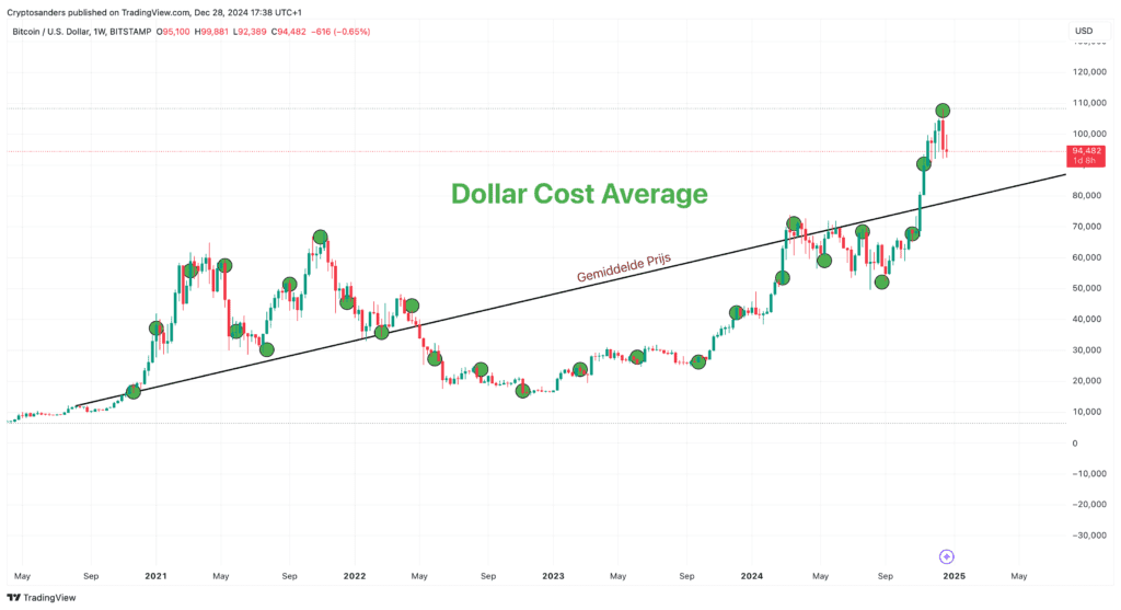 Dollar-Cost Averaging (DCA) is een strategie waarbij je op regelmatige tijdstippen een vast bedrag investeert, ongeacht de marktomstandigheden. Het doel van DCA is het minimaliseren van de impact van marktvolatiliteit door consistent te investeren over een langere periode. Door op verschillende momenten te kopen, egaliseer je de prijs waartegen je investeert, wat helpt om het risico van slecht getimede aankopen te verminderen.