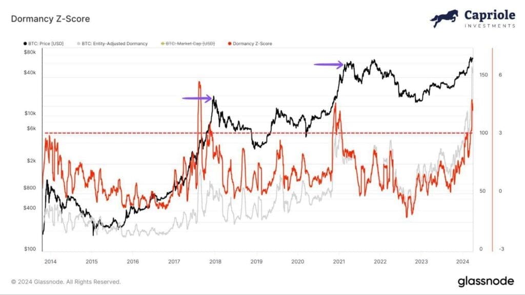 Dormantie Flow geeft de gemiddelde leeftijd van de uitgegeven munten aan. In 2024 werd opgemerkt dat de Dormantie Flow significant piekte, wat suggereert dat oudere munten worden verplaatst. Historisch gezien zien we markttoppen ongeveer drie maanden na zo’n piek in Dormantie Flow.