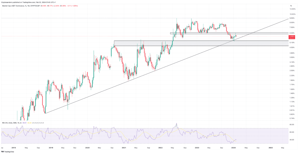 De dominante positie van $USDT maakt het meer dan alleen een veilige haven; het fungeert ook als een barometer voor het sentiment in de cryptomarkt. Een stijging in de $USDT dominantie kan duiden op een algemeen gevoel van onzekerheid of angst, terwijl een daling kan wijzen op optimisme en een bereidheid om terug te duiken in de meer volatiele cryptomarkten. Door deze trends te volgen, kunnen beleggers hun strategieën afstemmen en beter voorbereid zijn op de toekomstige marktbewegingen.
