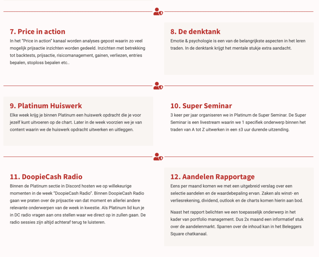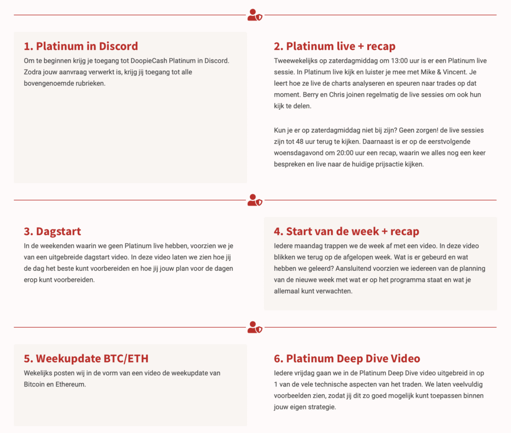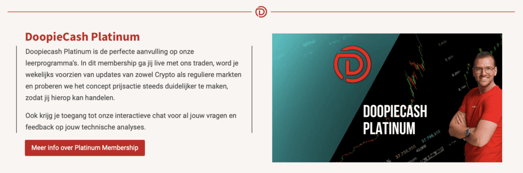 Het DoopieCash Platinum lidmaatschap is bedoeld voor ervaren traders die hun kennis en vaardigheden willen verbreden. Het biedt toegang tot een hechte community, live handelssessies, dagelijkse content en koersupdates, en uitgebreide analyse van prijsactie. Leden krijgen toegang tot exclusieve Discord-kanalen voor dagelijkse inzichten en een ondersteunende sfeer. Het lidmaatschap omvat tweewekelijkse live sessies, uitgebreide video’s over dagelijkse marktvoorbereiding, technische analyses, en een focus op emotionele en psychologische aspecten van trading.