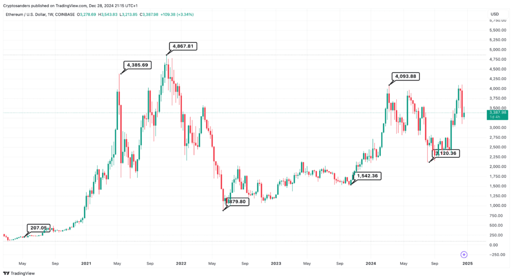 De prijs van Ether heeft een tumultueuze reis doorgemaakt in 2023 en 2024. Hieronder een samenvatting van de belangrijkste bewegingen: