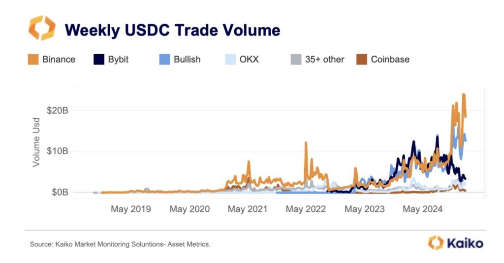 - Binance domineert de USDC-handel, maar de concurrentie tussen stablecoins neemt toe.