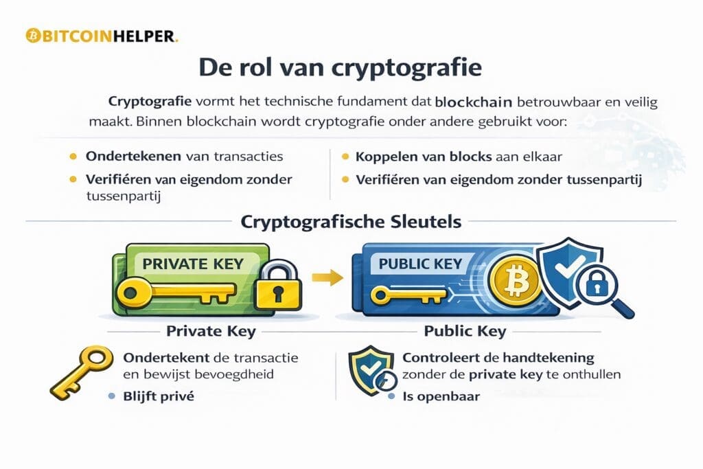 Cryptografie zorgt ervoor dat transacties kunnen worden geverifieerd, eigendom kan worden bewezen en data niet ongemerkt kan worden aangepast. Zonder cryptografie zou een gedecentraliseerde blockchain niet veilig kunnen functioneren.