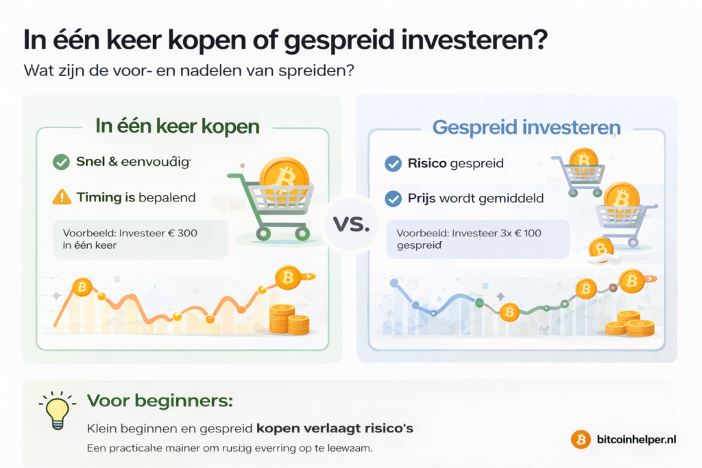 Naast de vraag hoeveel je koopt, is er nog een belangrijke keuze: koop je alles in één keer, of verspreid je je aankopen over meerdere momenten? In één keer kopen is het meest eenvoudig. Je kiest een bedrag, koopt Bitcoin en bent klaar. Dit werkt goed als je klein begint of als je het proces vooral wilt leren kennen.