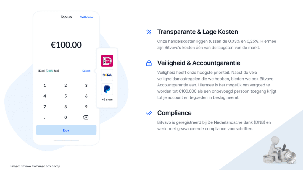 De kostenstructuur is een belangrijk onderdeel van deze ICONOMI vs Bitvavo vergelijking. Bitvavo staat bekend om zijn lage handelskosten. De standaard fee bedraagt 0,25 procent per transactie, en deze daalt naarmate je meer handelt. Voor stortingen via iDEAL worden doorgaans geen extra kosten gerekend, wat het voor Nederlandse gebruikers extra aantrekkelijk maakt.