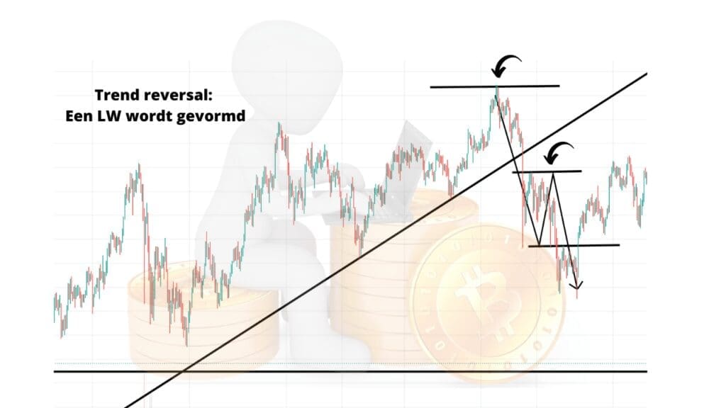 - Uitbraak: De prijs breekt door de trendlijn heen, wat vaak een eerste aanwijzing is dat de bestaande trend aan kracht verliest.